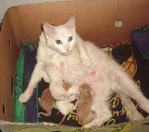 Dos años después de adoptar a "Rinrin," volviendo a casa de comprar comida para llevar vimos una gata cubierta de barro, con frío, con hambre. Pensé que era injusto que nosotros tuviésemos comida y ella no, y siendo que le había dado mil vueltas a la anterior adopción, esta fue inmediata. La limpiamos y le dimos de comer y la recuperamos hasta que se puso fuerte y descubrimos que venía embarazada. La llamamos "Mutter," porque estábamos estudiando alemán, nuestro sueño entonces era vivir en Alemania. Cuando sus gatitos estuvieron fuertes los dimos en adopción a familias que los quisieran mucho.