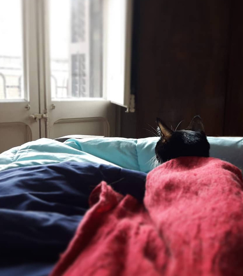 Fue muy difícil. Al cabo de dos días sin apenas comer y beber, pudimos dormirla en nuestra cama, la cama que compartíamos como una familia humana-gatuna, una familia a la que ahora le hace mucha falta uno de sus miembros. El último momento que estuvimos a solas, Panterita miraba por la ventana.